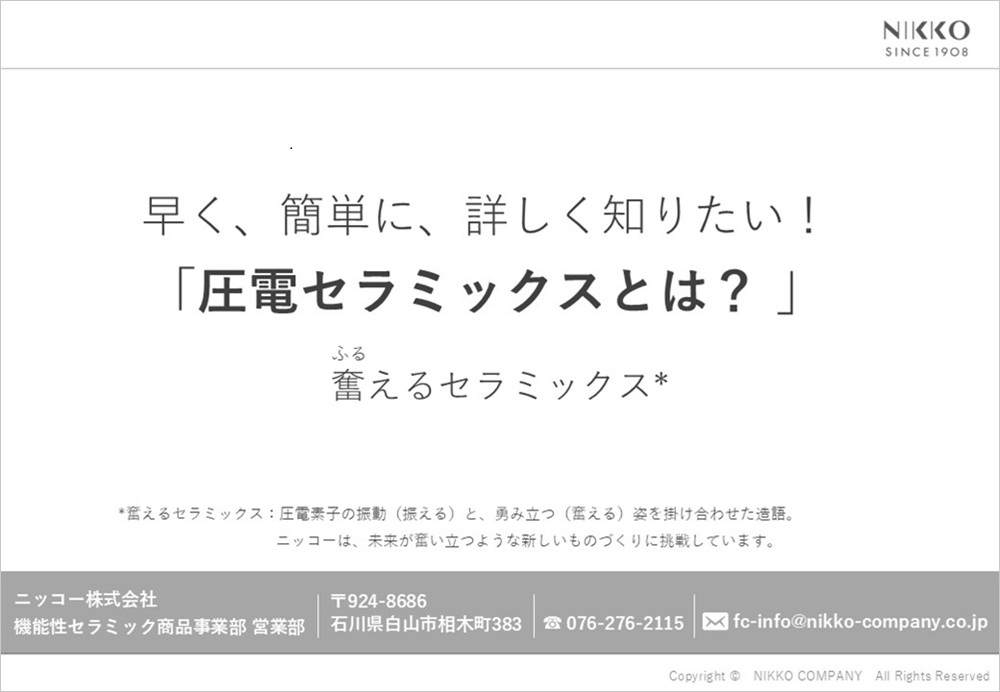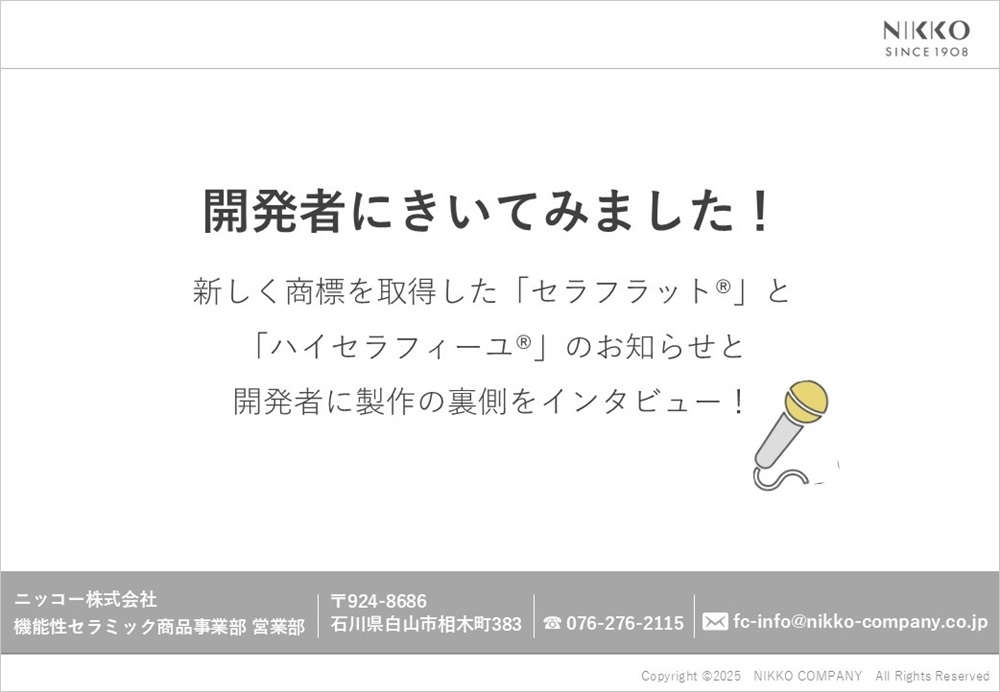 ニッコー株式会社(機能性セラミック商品事業部)では、各種用途に応じた高機能セラミック製品を展開しています。本ページでは、それぞれの製品特長や、応用事例、導入メリットを解説した技術資料をまとめてご覧いただけます。製品検討や課題解決のヒントに、ぜひご活用ください。