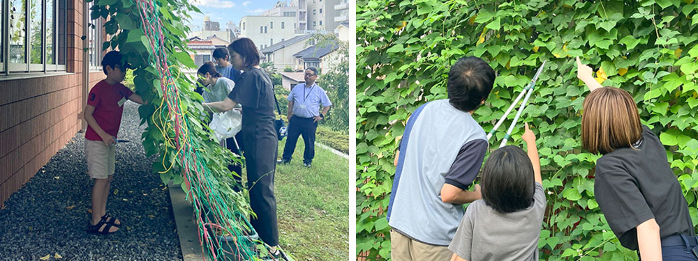 5月に苗植えをした「加賀つるまめ」は、金沢市役所第二本庁舎の2階部分まで成長しており、その様子を参加した小学2年~6年生の児童とその保護者が観察し、収穫体験を行いました。イベント後半で行われた意見交換会では、全3回行われたイベントを通して感じたことや、グリーンカーテンの普及のためのアイデアを考え、発表していただきました。